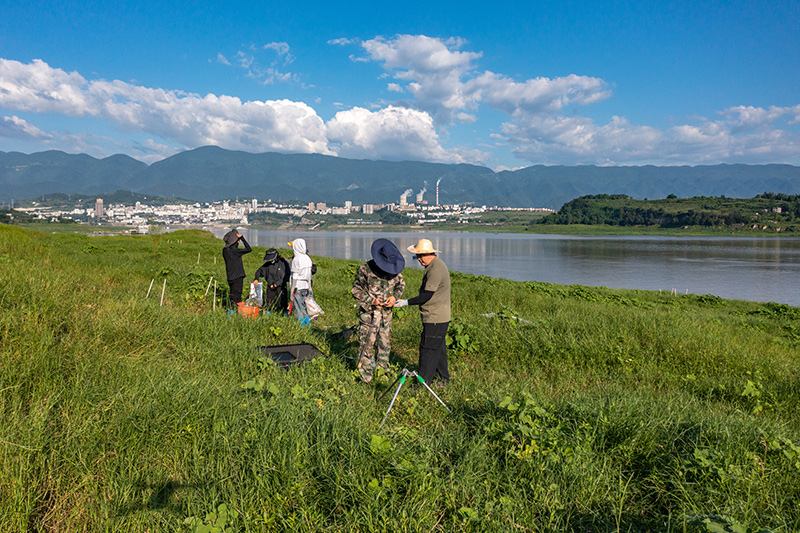 在位于重慶的中國科學院三峽庫區(qū)水(shuǐ)土保持與環境研究站(zhàn),中國科學院成都山(shān)地所科研人(rén)員在庫區(qū)消落帶上(shàng)開(kāi)展相關監測(2023年7月5日攝,無人(rén)機照片)。新華社記者 黃偉 攝