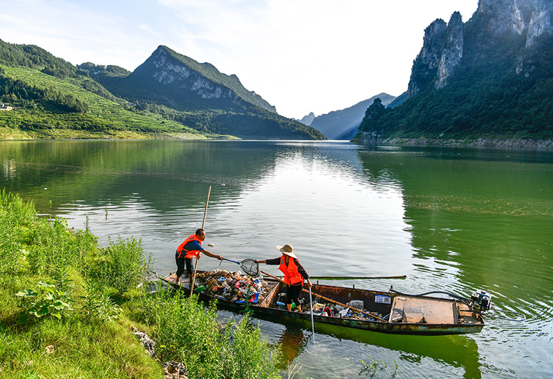 貴州省甕安縣珠藏鎮豐岩村村民盧錫永、冉茂英夫婦駕駛小(xiǎo)船(chuán)在烏江上(shàng)打撈漂浮物(2023年7月10日攝)。新華社記者 楊文斌 攝
