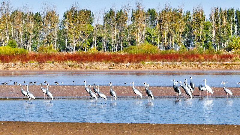 在山(shān)東黃河(hé)三角洲國家(jiā)級自然保護區(qū)拍攝的白枕鶴(2022年10月18日攝)。新華社發(楊斌 攝)