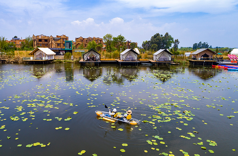 遊人(rén)在滇池南岸晉甯區(qū)上(shàng)蒜鎮小(xiǎo)漁村劃船(chuán)休閑(2023年4月30日攝,無人(rén)機照片)。新華社記者 陳欣波 攝